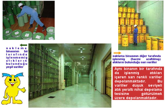 İçleri düşük seviyeli atıklarla doldurulmuş yeşil renkli variller tesisin saklama (depolama) bölümüne alınmakta ve hacim azaltma işlemine başlanıncaya kadar bu saklama alanında bekletilmektedir.
