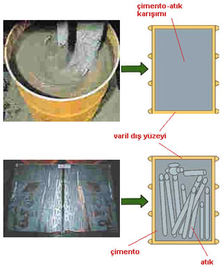 Sıvı atıkların buharlaştırma ve kurutma süreçlerinden geçirilmesi sonucunda oluşan derişik çamur, katı atıkların yakılması sonucunda oluşan kül, katı atıkların sıkıştırılması sonucunda oluşmuş hacmi azaltılmış katı atıklar ve sıkıştırılmaya uygun olmayan diğer atıklar, çimento veya plastik ile birleştirilerek katı ve sabit hale dönüştürülmekte, sarı renkli varillerin içine doldurulmaktadır.
