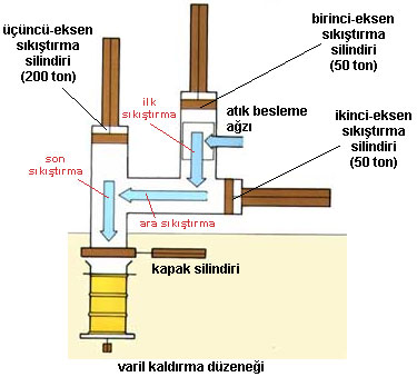Son sıkıştırma aşamasında ise üçüncü eksene sıkıştırma silindiri vasıtasıyla 200 tonluk bir gücü uygulanmaktadır. Bu düzenek yardımıyla 1/4'lü hacim azaltma oranlarına ulaşılabilmektedir.