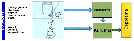 Sıvı atıklara örnek olarak, çamaşırların yıkanması ve teçhizatların temizlenmesi sonucunda oluşan atık su gösterilebilir. Bu tür atıklar ilk önce "buharlaştırılma" işlemine alınmaktadır. Buharlaştırma işleminden sonra geride yoğun bir sıvı çamur kalmaktadır. Bu yoğun sıvı çamur daha sonra kurutma işlemine tabi tutulmaktadır. Bu yöntemle sıvı atıkların hacimleri 1/500 oranında azaltılabilmeketdir.