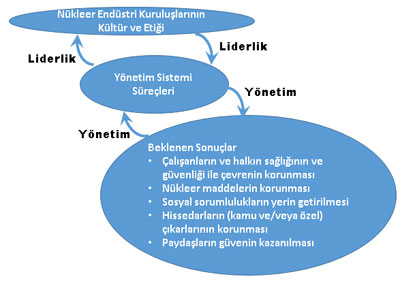 Şekil 1, bir nükleer endüstri kuruluşunun kültürünün ve etiğinin yönetim sistem süreçlerinin temel dayanağını oluşturduğunu göstermektedir. Dünyanın nükleer endüstri kültürü, bazı faaliyetleri başkalarına devretmiş olsa bile tesislerin güvenlik ve emniyetinden her zaman için işletmeci kuruluşun sorumlu olduğu üzerine kuruludur. Bu nedenle çalışanların, alt yüklenicilerin ve halk sağlığı ve güvenliğinin korunmasının yanında çevrenin korunması nükleer endüstri kuruluşları için temel prensip olmalıdır. Şekil 1 aynı zamanda kuruluşun yönetimi, kültür ve etiği ile yönetim sistemleri arasındaki ilişkiyi de tasvir etmektedir. Üst düzey yönetici ve liderler söylemleriyle ancak bundan daha da önemlisi davranışları ve kuruluşun performansını izlemeleriyle söz konusu kuruluşun kültürü ve etiğini etkilemektedir.